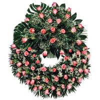 Corona clásica de 20 rosas y claveles rosas para una majestuosa despedida.