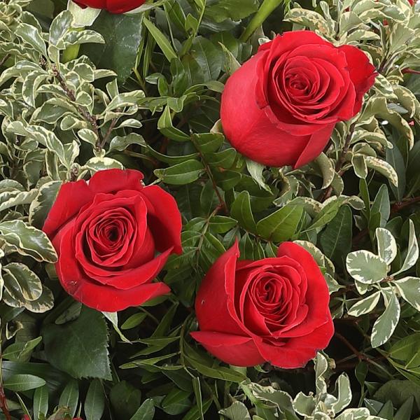 Un centro de flores clásico formado por 60 rosas rojas y complementado con tallos de paniculata y verdes variados. Dicen que "donde no llegan las palabras, llegan las flores" así que este centro de rosas es una muestra ideal de nuestro apoyo y afecto a la familias.